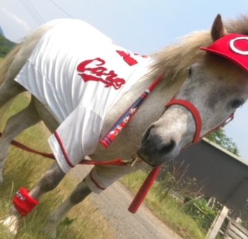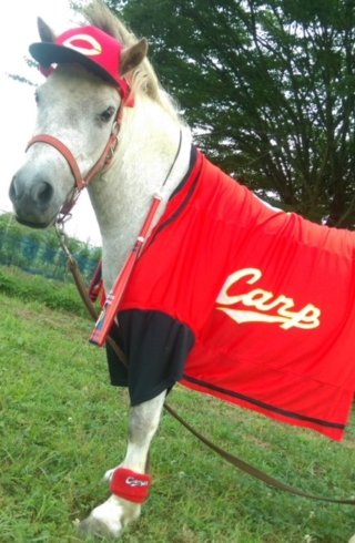 なんとカープユニフォームを着たくーちゃんが!可愛らしすぎるお姿です。馬用にユニフォームを作った店主の方の想像を絶するほどの苦労が伝わってきます。