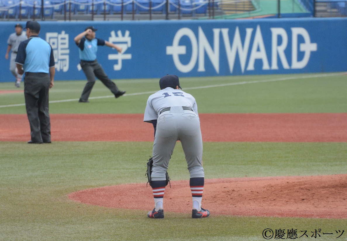 中1日となる高橋亮吾(総3・慶應湘南藤沢)の最後の踏ん張りどころだったが、打球がふらふらと上がりショート後方に落ちてしまう。二塁走者まで生還し、3-4と逆転されてしまう。