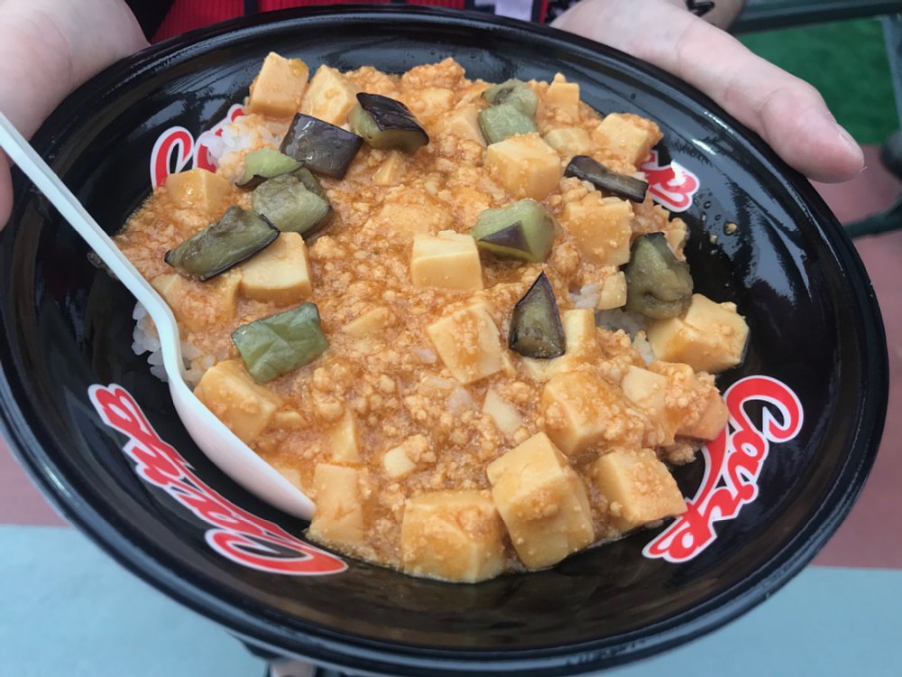ジメジメが続くマツダスタジアムをピリッと引き締めてくれそうな、ピリ辛仕立ての麻婆丼です。茄子と豆腐、攻守共に楽しめちゃいます。展開があまりない、まったりとした試合の時などにはちょうど良い刺激になるかもしれません。