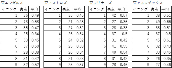 たとえば、イニング別の失点を同地区のライバルたちと比較してみる(現地6月20日)。