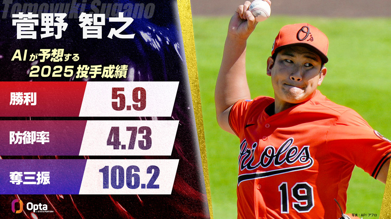 いくつか気になる点はあるが、特筆すべきは、AIが今季オリオールズの先発ローテーションで4番手あたりに位置すると目されている菅野のシーズン途中でのブルペン行きを予測しているところだろう。