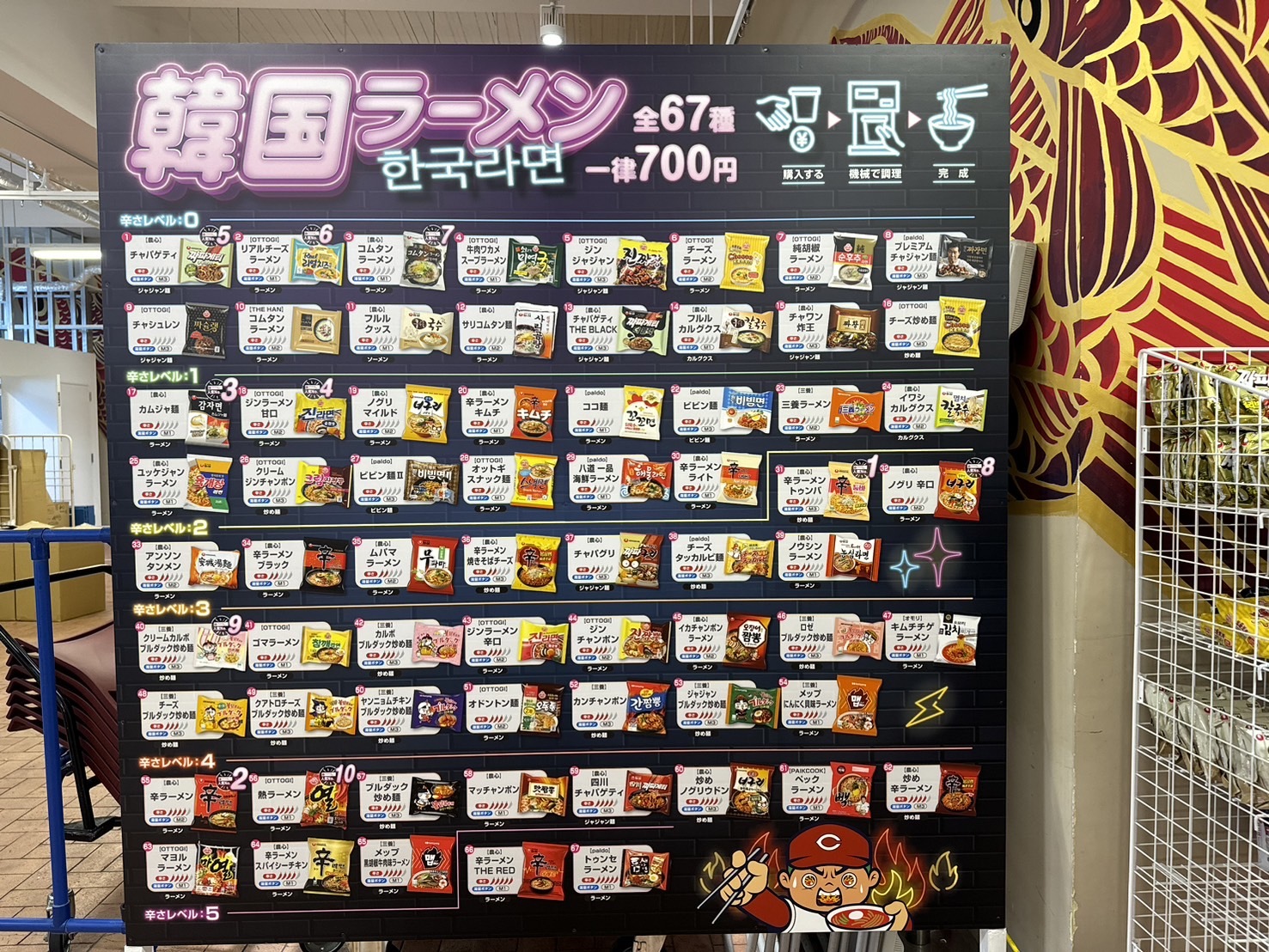 コンコースのグッズ売り場奥のスペースが、韓国ラーメンスタンドになっていた。棚にはさまざまな袋の韓国ラーメンがずらりと並ぶ。その数67種類。ものすごく辛いものから全く辛くないもの、スープがあるもの・汁無し系のものまでとにかく色々な種類に圧倒され見ているだけでワクワクする。