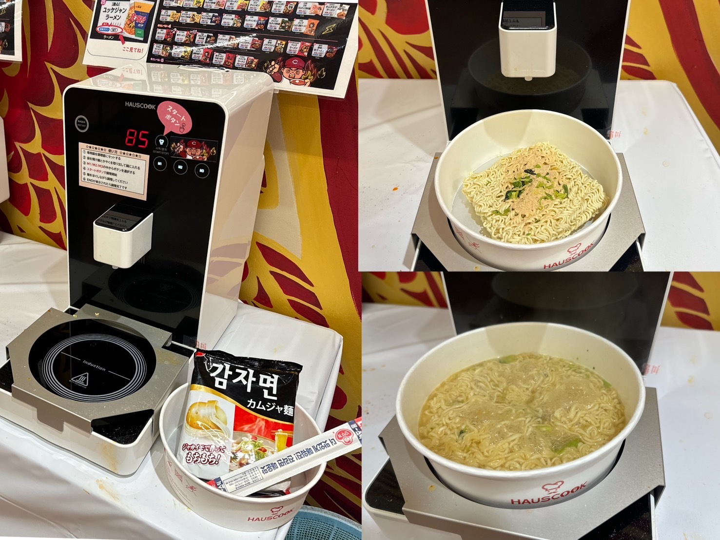 いよいよ自分の番がやってきた。もらった容器に麺・粉のスープ入れ、マシーンにセットする。ボタンは3種類の時間設定があるようで、自分の買った麺に合うM1ボタンを押した。