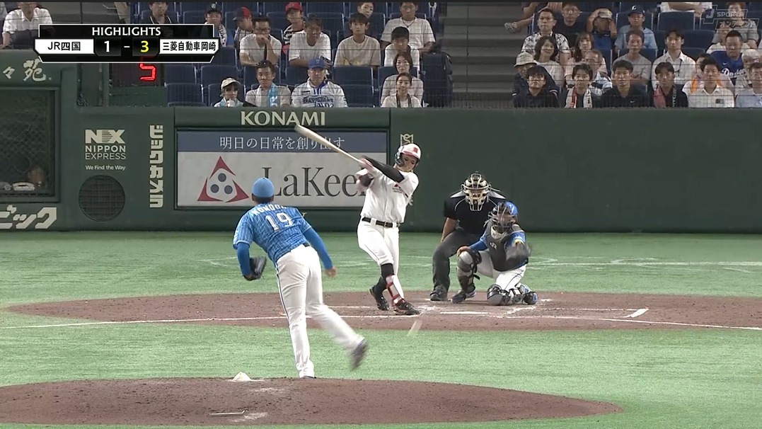 三菱自動車岡崎は秋山凌祐、JR四国は近藤壱来と右の好投手が登板して試合は始まる。JR四国は3回裏、四死球で一死1・2塁のチャンスを作り、3番・大北海斗のレフト前タイムリー安打で先制。しかし、続く一死満塁では得点できず,1点にとどまった。