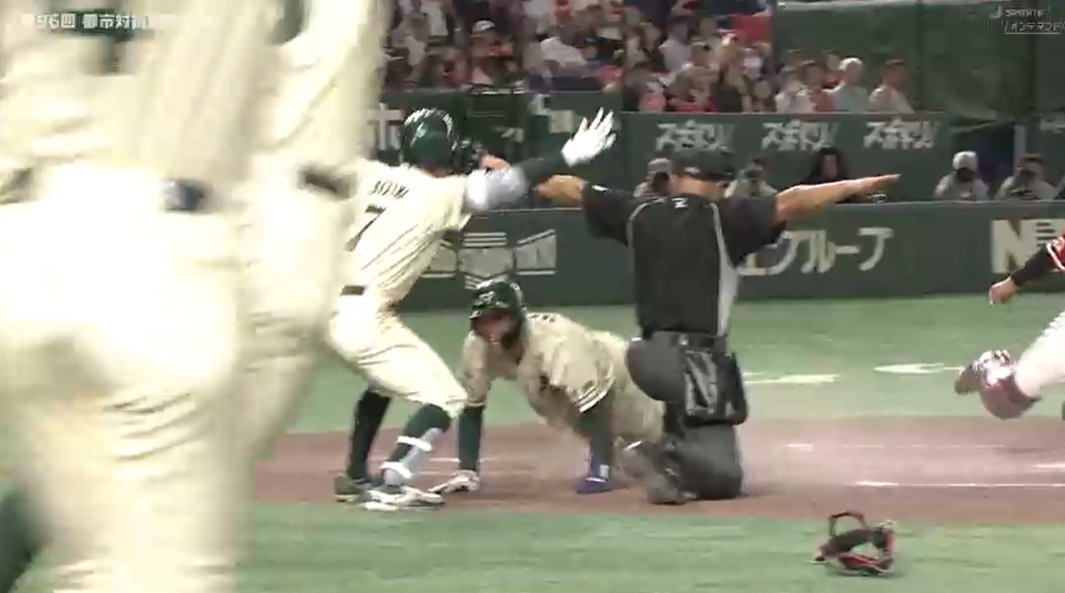 すると、東芝は8回表に内野ゴロの間に1点を加えて追い上げ、9回表に追いつく。9回一死1塁から光本の放った1・2塁間のゴロは、福武修の好守で1塁アウトと判定された。しかし「ビデオ再検証」で判定が内野安打に改まり、一死1・2塁となる。東芝は二死から9番・中村浩人がタイムリー二塁打を放ち、試合は8-8と振り出しに戻った。