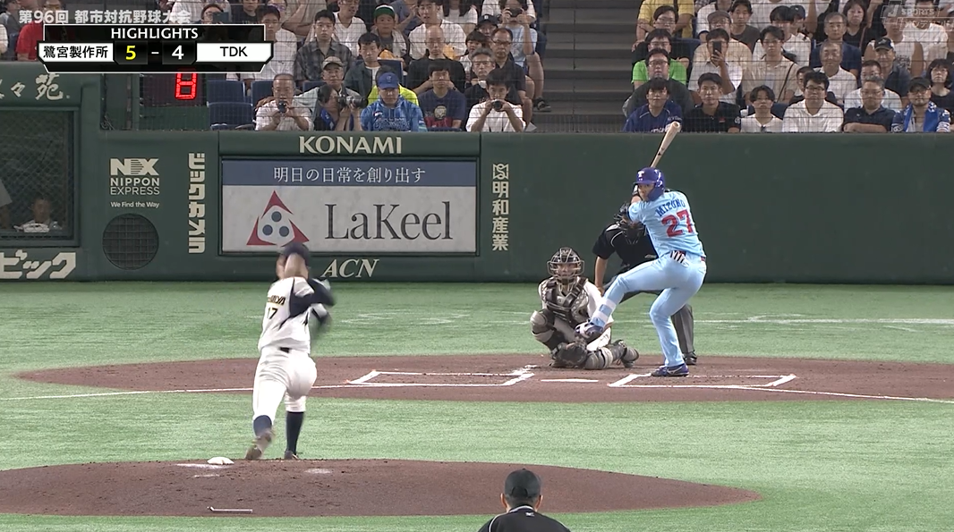 しかし、TDKも粘りを見せる。8回表には2番・北畠栞人が二死からセンター前にタイムリー安打を放ち3点差。9回表二死には、代打・打川和輝がレフトポール際に2ラン本塁打を放ち、1点差まで追い上げた。