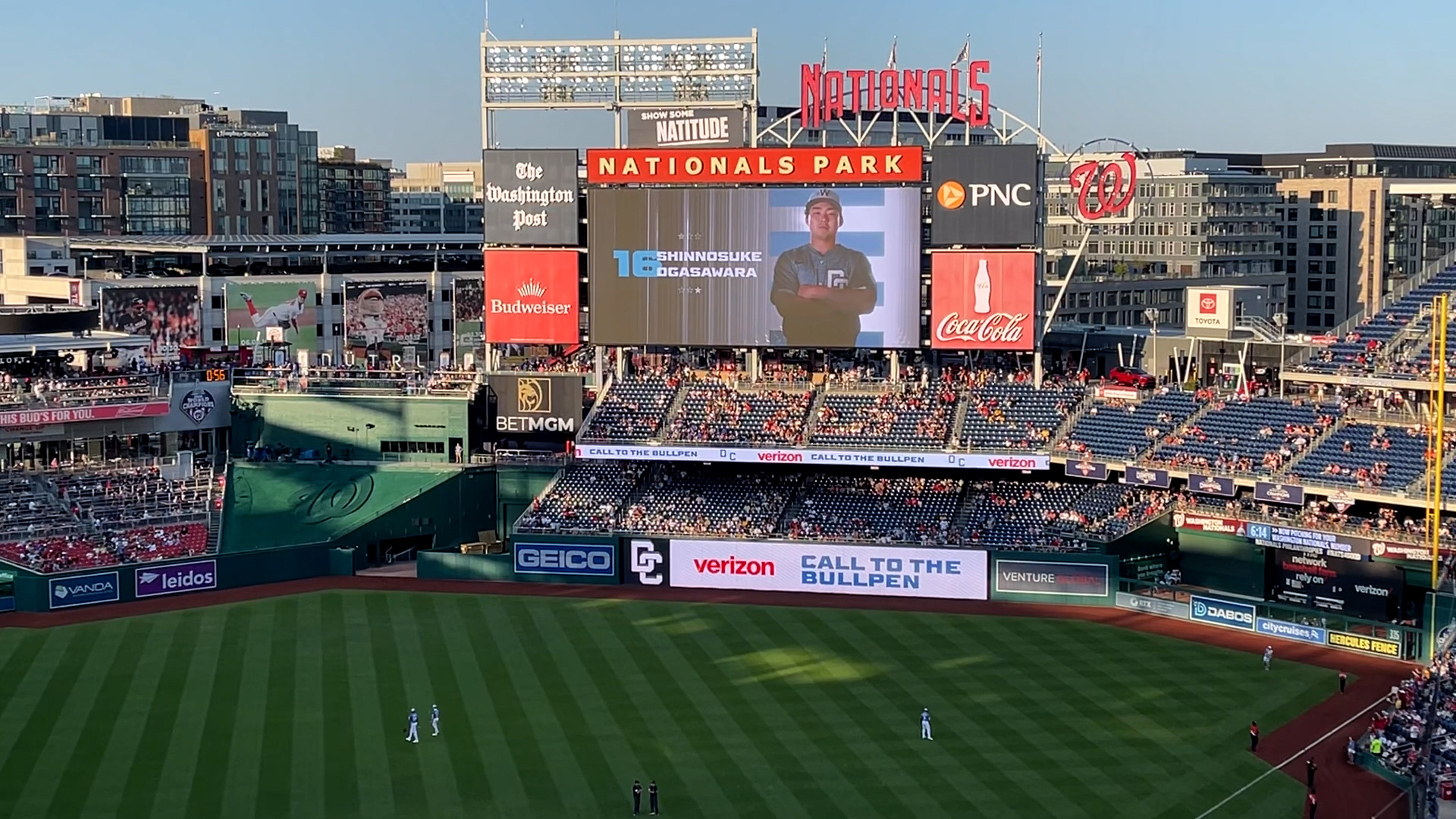 7月の取材時は敵地だったので、この時初めて本拠地のマウンドに立つ慎之介さんを生で見ることができました。ナショナルズ・パークはブルペンが外野にあります。試合中そのブルペンを注目して見ていたのですが、慣れないリリーフ待機の中でもだいぶ過ごし方を掴んでいるようでした。登板時は投球10球ほどでブルペンを後にすることもあるとか。MLB仕様の登場曲・Coldplayの「Clocks」を背に、外野から走ってマウンドへ。本拠地ファンからの大きな声援は期待の現れだと感じました。
