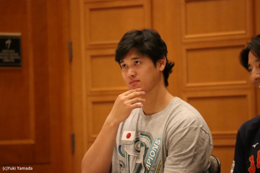 「3年後のWBCは出たいか?」と問われた会見場の壇上。大谷は自分へのプレッシャーをかけるとともに胸の内を明かした。
