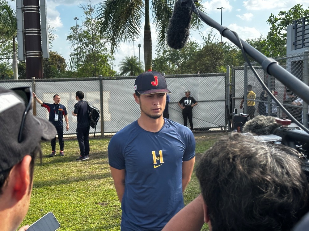 2023年大会時、マイアミでのチーム練習後に取材対応するダルビッシュ