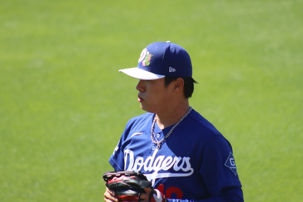 2月27日、ドジャースのオープン戦登板後、侍ジャパンに合流した山本