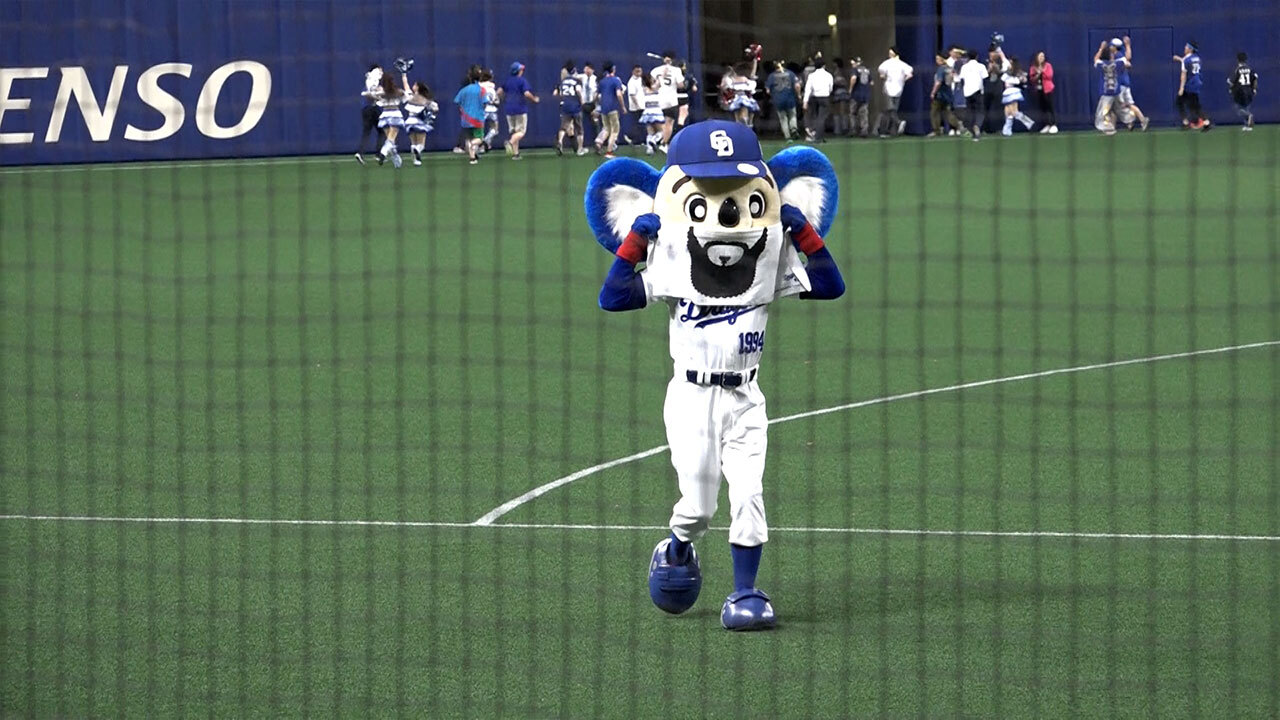 アルモンテ選手のヒゲタオルをまとって登場したドアラ(筆者提供)