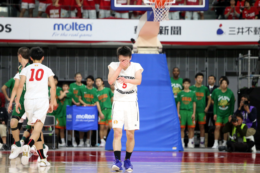 大会3日目、男子の2回戦で東山(京都)は、福岡第一(福岡)に敗れた。54-83という相手の力を見せつけられる、苦しい試合だった。第3ピリオドが終わった時点で37-58。焦って攻める最終ピリオドでさらにリードを広げられ、勝利は遠のいたが、最後まで得点を狙った。しかし、試合の最後に相手のファウルを得た東山の吉田竜丸(3年)がフリースローを投げるとき、スコアボードが現実を告げていた。残り時間1秒。2本のフリースローを投げ終われば、時計は動き出し、東山の挑戦は終わる。1投目を終えた吉田は、涙をぬぐった。