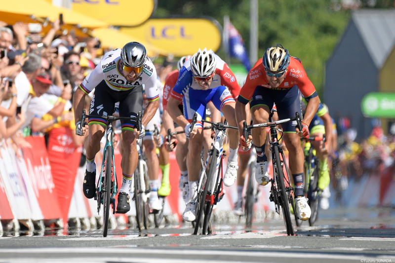 ラスト2kmの右カーブが、流れを変えた。集団の前方で落車が発生し、黄色のフェルナンド・ガビリアは地面に倒れ込んだ。難を逃れたひと握りの選手だけで小集団スプリントが争われ、ペーター・サガンが区間勝利を手に入れた。世界チャンピオンの証アルカンシェルの上にマイヨ・ジョーヌを重ね着し、さらには過去5年間に渡って我が物としてきたマイヨ・ヴェールも、2年ぶりに取り戻した。