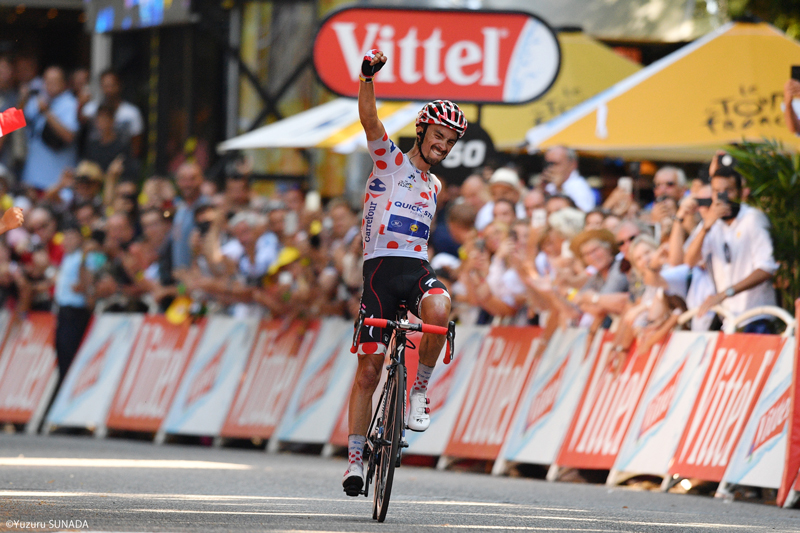 これぞ黄金パターン。1度目の休息日明けの、アルプス初日の下りフィニッシュで、21人の大きな逃げに乗ったジュリアン・アラフィリップは独走勝利を勝ち取った。そして2度目の休息日明けの、ピレネー初日の下りフィニッシュで、47人の巨大な逃げに乗ったアラフィリップが、興奮に沸くフィニッシュラインへひとりで姿を現した。「パリまで守れなくても失望はしないけれど」と改めて繰り返しつつも、パリ到着まで5日、改めて山岳ジャージもしっかりと着込んだ。
