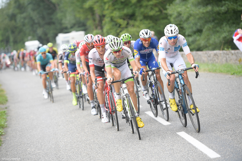 上りで逃げ集団は小さくなり、下りで再び大きくなる。そんな繰り返しの中で、マンテ峠から下り切った先の谷間では、逃げ集団は17人に絞り込まれた。最終ポルティヨン峠の上りが開始すると、再びエスケープは小さく切り刻まれていく。