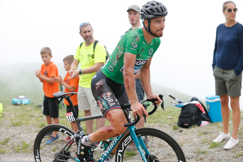 出走と同時にぽろぽろと集団から脱落していったスプリンターたちも、なんとか全員無事に65kmを走り切った。激しい落車の犠牲となり、傷だらけ、血だらけになりながらも、マイヨ・ヴェールのピーター・サガンもフィニッシュにたどり着いた。レントゲンの結果、幸いにも骨折等はなかった。本人もパリまで走り続けることを宣言している。
