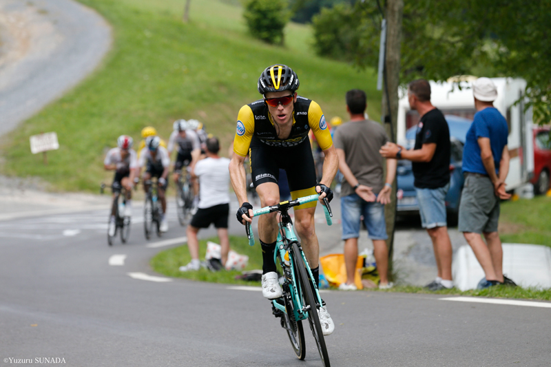 ちょっぴり心配だったのは、山岳賞2位ワレン・バルギルもまた、逃げに乗ったこと。すでに67ptものリードをつけていたし、今区間は最大でも72ptしか収集できないから……勝負は終わったも同然だった。スタート前にはバルギルも「もはや山岳は狙わない。区間一本に絞る」と宣言していた。それでもアラフィリップは、最大級の警戒を解かなかった。やはり前集団に入ったチームメートのボブ・ユンゲルスの助けも得て、1級アスパン峠で見事な先頭通過を果たす。