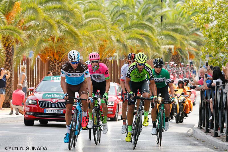 そのメイン集団では、クイックステップが、絶妙なさじ加減でコントロールを行った。2つの山岳では……特に登坂距離20kmを超える1級マドロニョ峠では、ヴィヴィアーニが脱落してしまわぬよう、適度なスローペースを刻んだ。2つの山を越えてからは、逃げの6人の逃げ切りを許してしまわぬよう、距離をじりじりと1分半程度にまで縮めた。その後も細かい起伏は執拗に繰り返されたが、青い隊列は、自陣のスプリントエースを完璧な形で保護し続けた。