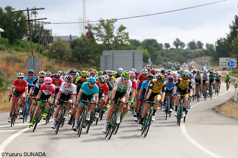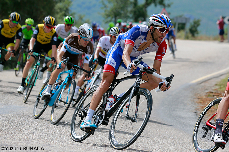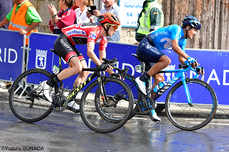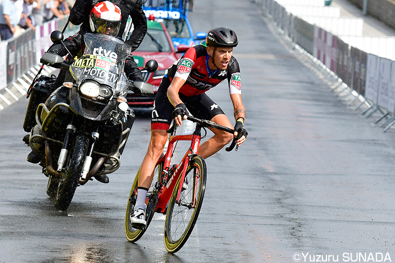 ステージ後半を延々コントロールしてきたモヴィスターのおかげで、残り15kmほどで、ピノの暫定マイヨ・ロホは消えた。さらに総合勢が本格的な戦闘モードに入ったのは、フィニッシュまでようやく5kmに迫ってから。EFエデュケーションファーストが隊列を組み上げると、突如としてスピードアップを図ったのだ。