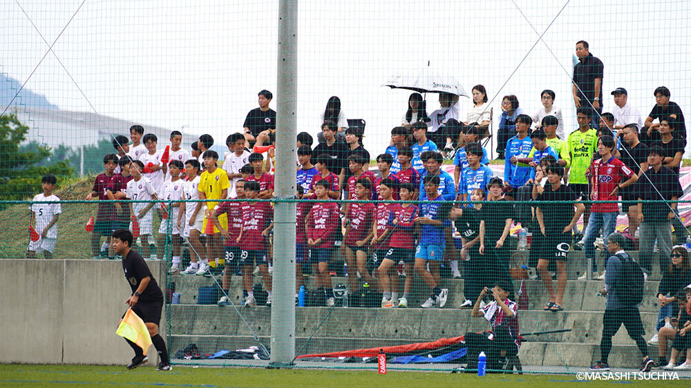 勢いは間違いなく岡山U-18が上回っていた。「後半は前からハメに行ったので、攻撃的な守備ができて、自分たちの攻める回数も多かったですし、メンタル的にも改善されたんじゃないかなと思います」とは脇本。フィニッシュの回数も増え、押し込む時間が続く中で、73分には田邊健太のクロスから安西来起がヘディングで合わせる豪快なゴール。スタンドに陣取ったU-15の選手たちも、一段階ボルテージが上がる。