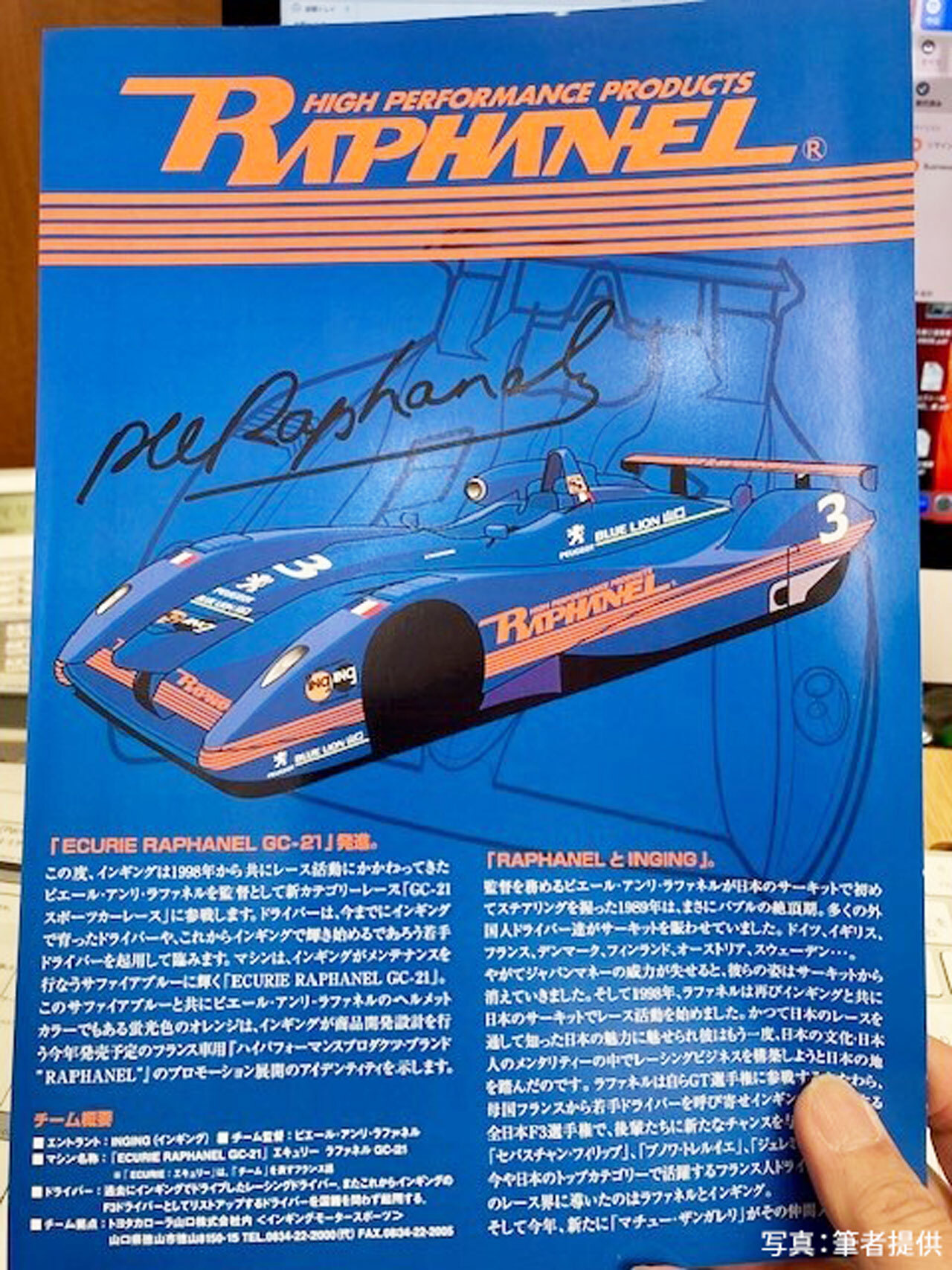 彼のドライブした青いGC21マシンのボディサイドにオレンジ色の【RAPHANEL】の文字が。この巡り合わせがなかったら4度のSUPER GTチャンピオンを獲得するドライバーは生まれなかった。ラファネル氏はクインタレッリにとっての恩人だ。