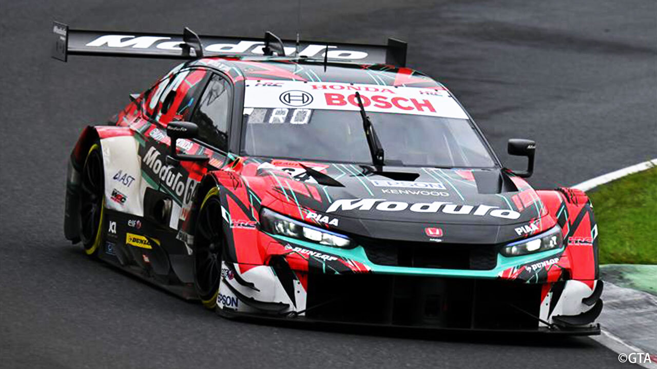 そのアクシデントに巻き込まれてマシンが大破してリタイアしてしまった64号車Modulo CIVIC TYPE R-GTは、リタイアしていなかったら表彰台は確実に立っていただろう。いや、勝てていたかもしれない。64号車はQ1で敗退、13番手から決勝をスタートしている。スタートを担当したのは伊沢拓也選手。8周目に10位、9周目に9位、11周目に8位、15周目に7位、24周目に6位、29周目に4位でピットインして大草りき選手へ交代。大草選手は、9位から32周目に8位、37周目7位、38周目に6位、40周目に5位、45周目に4位へ。そして47周目の最終コーナー先、10%勾配を上がりながらピットロード入り口付近を走行していた際、左側から突然アクシデントに巻き込まれたGT300車両が現れた。接触を避けようとしたが、彼の右側にはスペースがなく、GT300車両とガードレールに挟まれる形でクラッシュ、マシンは大破。幸いに大草選手には怪我はなかった。