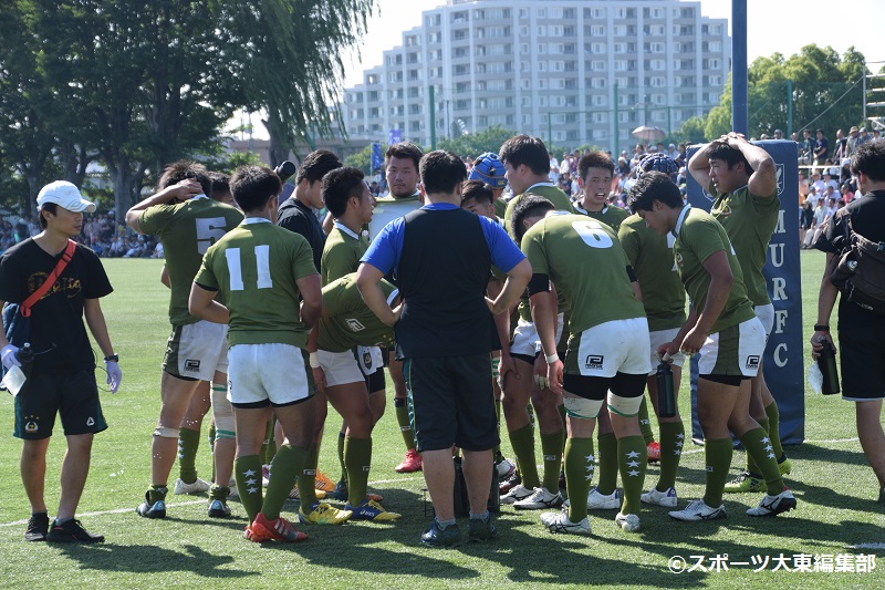 直後のキックオフでも明治がノーホイッスルトライを挙げ、その後も明治の猛攻を防ぎきれぬまま、0-47で前半を折り返す。