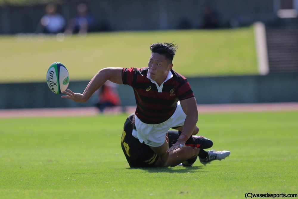 試合が動いたのは前半11分。HB(ハーフバック)団のSO(スタンドオフ)岸岡智樹(教3=大阪・東海大仰星)のオフロードパスからSH(スクラムハーフ)齋藤直人(スポ3=神奈川・桐蔭学園)が右大外にトライを決めると、そこから早大が主導権を握り続ける展開に。
