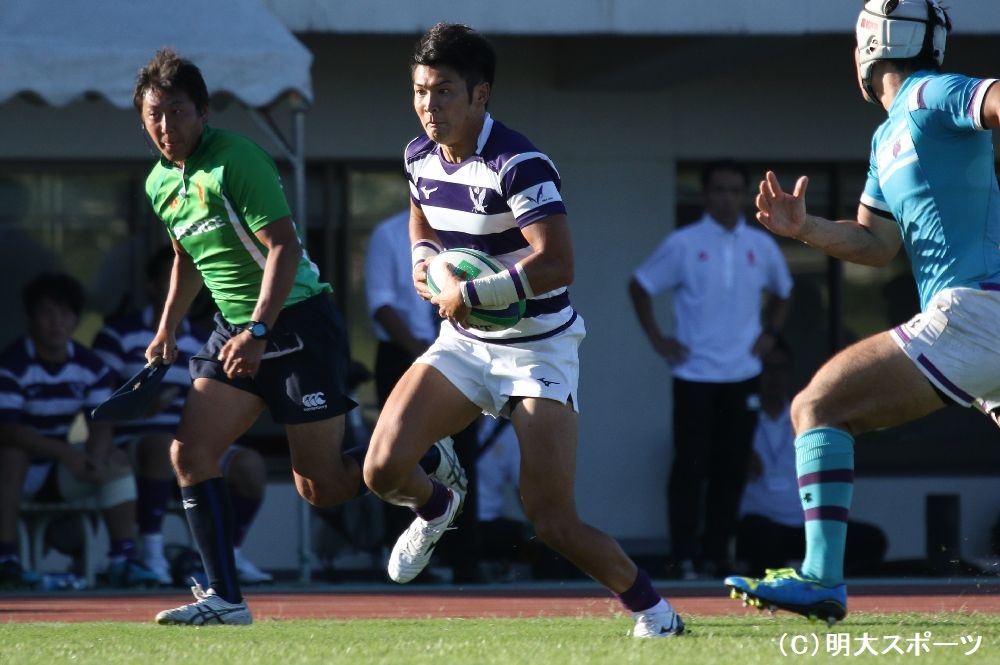 前半は先制点を奪われるなど、立ち上がりこそペースをつかめなかったが、WTB(ウイング)山村知也(営3=報徳学園)のトライを皮切りに明治が4連続トライ。