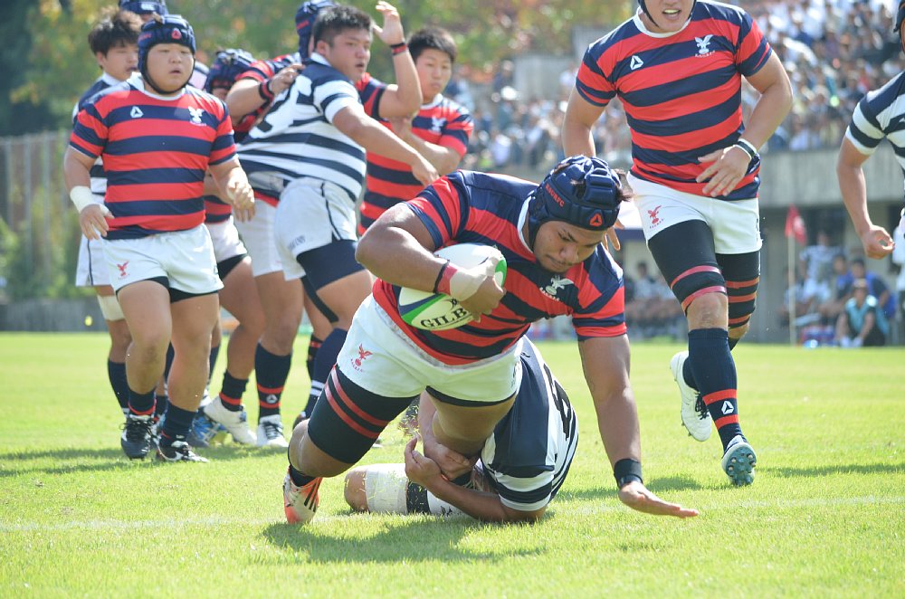 後半から出場のWTB(ウィング)寺崎栄一郎(4・海星)が脚を活かして大きくゲインするなどフェイズを重ねながら、前進し続け、ボールはキャプテン上田へ。ゴール前左側から相手ディフェンスの隙をうまくすり抜け、そのままゴール中央にトライ。ゲームを動かした。