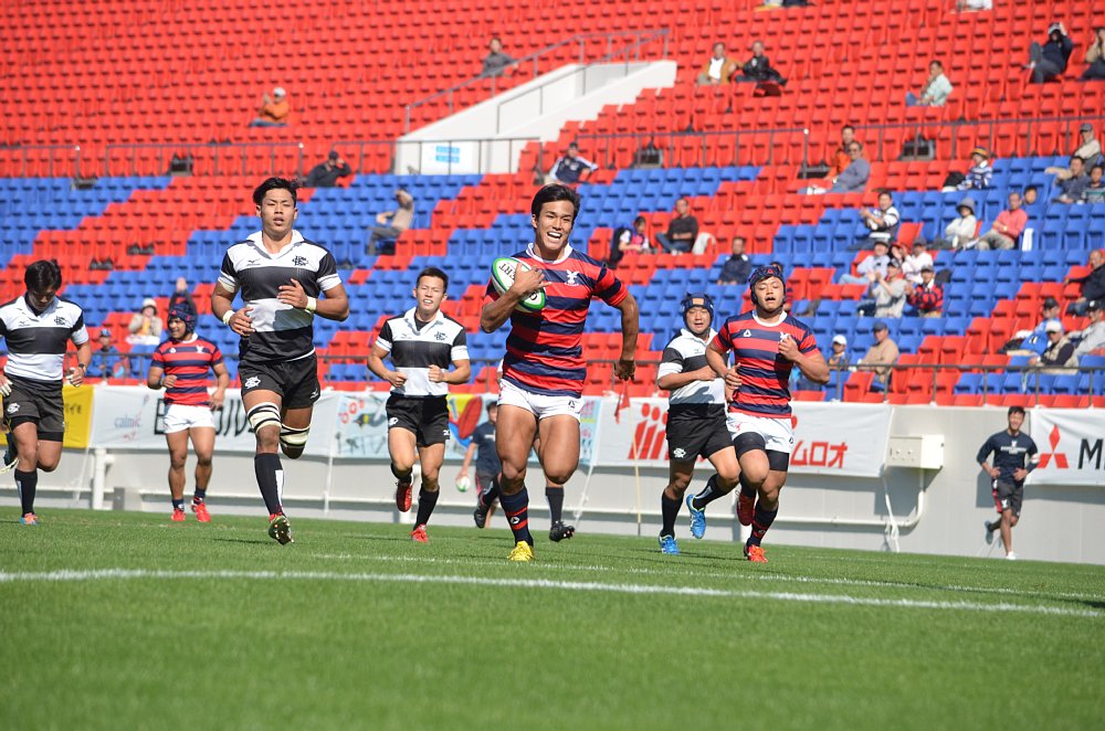 28分、ゴール前中央ラックから主将・上田克希(4年=東海大仰星)が持ち出しトライ。38分には栢本から代わった藤野毅郎(4年=流経大柏)がゴール左側でパスを受けて隅に飛び込む。新しい戦力の活躍に、最上級生も応えた。