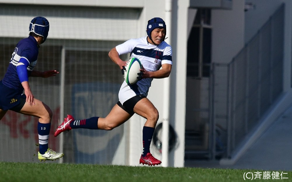 キャプテンCTB(センター)松山千大(3年)がボールを前に運び、最後はCTB高本幹也(3年)からSO(スタンドオフ)嘉納一千(2年)とつないでトライ。SO嘉納は自身でゴールも決めて、12-0とリードする。