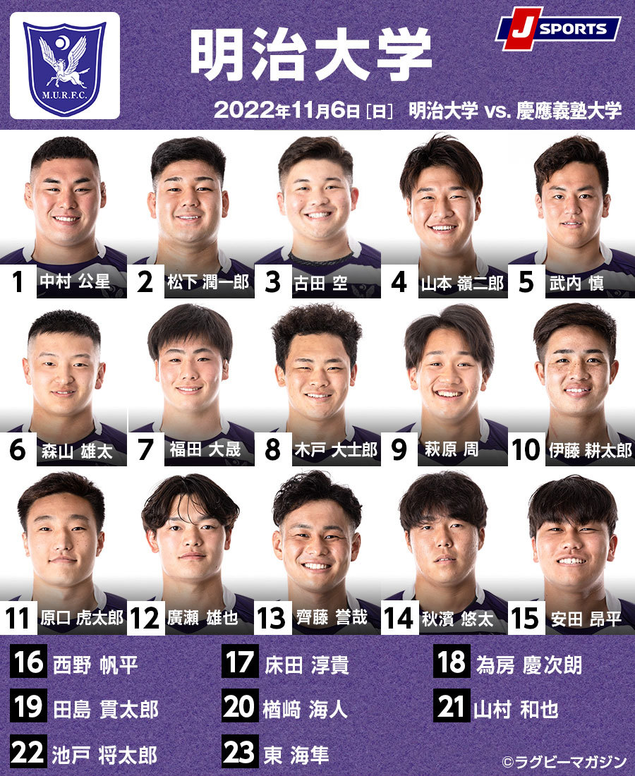 発表された登録メンバーを見ていくと、明治大は3週前の青山学院大戦から両PRとNO8の3人を変更した。1番は中村公星、3番には古田空が入り、HO松下潤一郎と強力フロントローを形成。LO陣はともに191センチの山本嶺二郎と武内慎のコンビだ。両FLは森山雄太、福田大晟の2人で、NO8には木戸大士郎が2試合ぶりに復帰した。