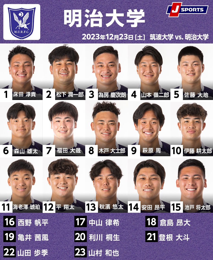 一方の明治大の早稲田大戦からの変更は1人だけ。LO佐藤大地が2試合ぶりのスターター復帰で5番に入り、亀井茜風はリザーブに回った。そのほかの14人は3週前に続きスタメンでの出場となる。また11月中旬に負ったケガからの復帰を目指すCTB廣瀬雄也キャプテンは、この試合もベンチからチームメイトをサポートする。