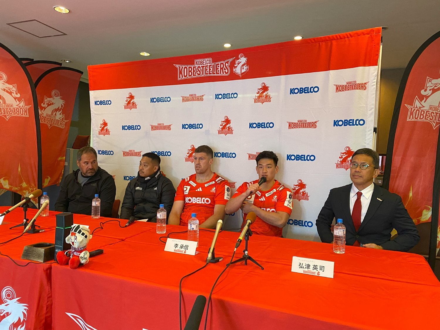 記者会見の登壇者は弘津英司チームディレクターと、就任2シーズン目となるデイブ・レニーDOR(ディレクターオブラグビー)/HC(ヘッドコーチ)、共同キャプテンのLO(ロック)ブロディ・レタリックと、日本代表のSO(スタンドオフ)/FB(フルバック)李承信の2人。