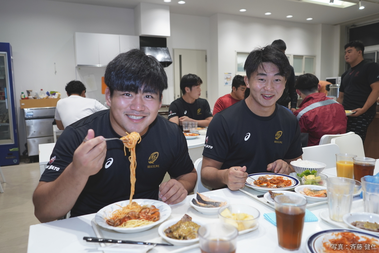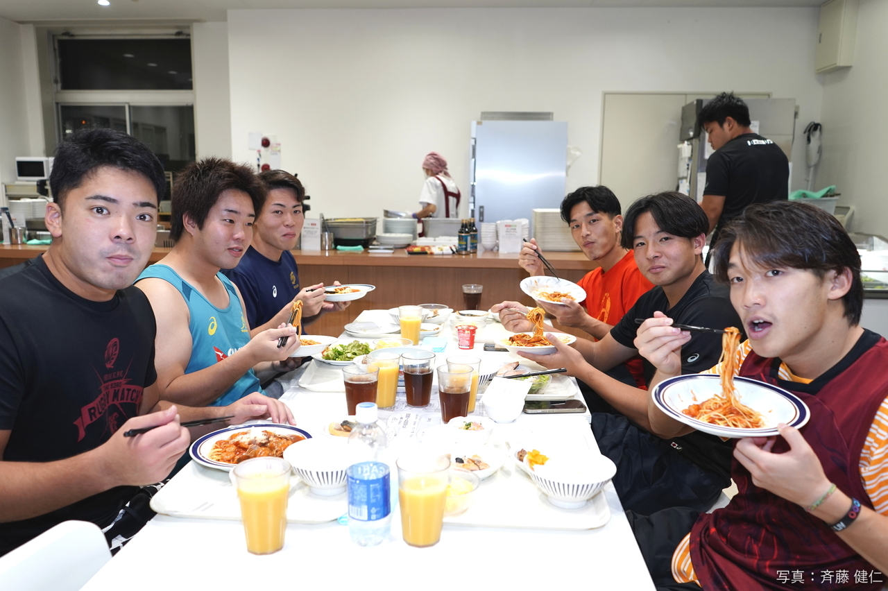 またBKリーダーのWTB(ウイング)安田昴平(4年)は「いつも美味しいですが、今日のイカとブロッコリーのパスタは一段と美味しかった! パスタはフィジカルアップにもつながるし、腹持ちが良くて効率的なエネルギー 源になると聞いています。僕は黒酢たまねぎのドレッシングが好みです!」と言えば、1年生ながら関東大学ラグビー対抗戦で11トライを挙げた1年生のWTB白井瑛人(桐蔭学園)は「パスタが大好きなので、試合前にパスタを食べることは自分のルーティンになっています!」と笑顔を見せた。