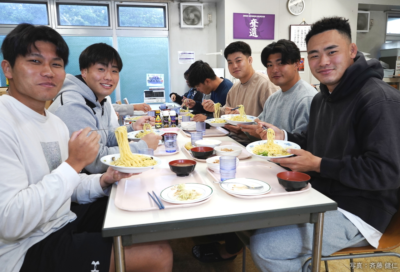 また、突破力でBK(バックス)の中軸の一人であるCTB(センター)福島秀法(3年)は「今日のパスタは魚介で美味しかったです!パスタは練習後だけでなく、試合前日にも食べていますが、効率的なエネルギー源になると聞いています」と言えば、1年生ながらそのロングキックで10番を背負い続けているSO(スタンドオフ)服部亮太(佐賀工業)は「今日のパスタは食べやすかったです! 体重を増やさないといけないので量を食べないといけないのですが、美味しく食べられました!」と破顔した。