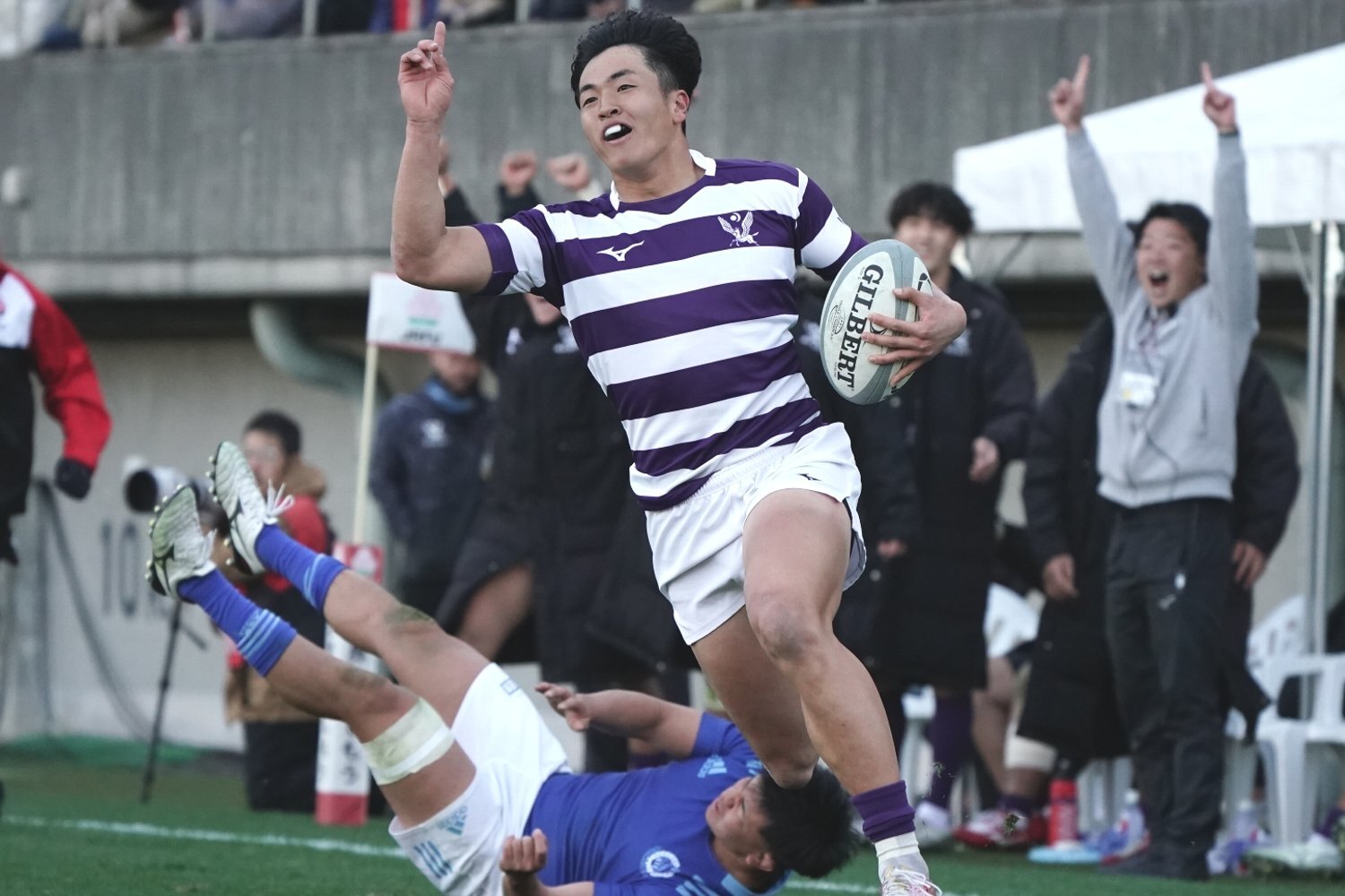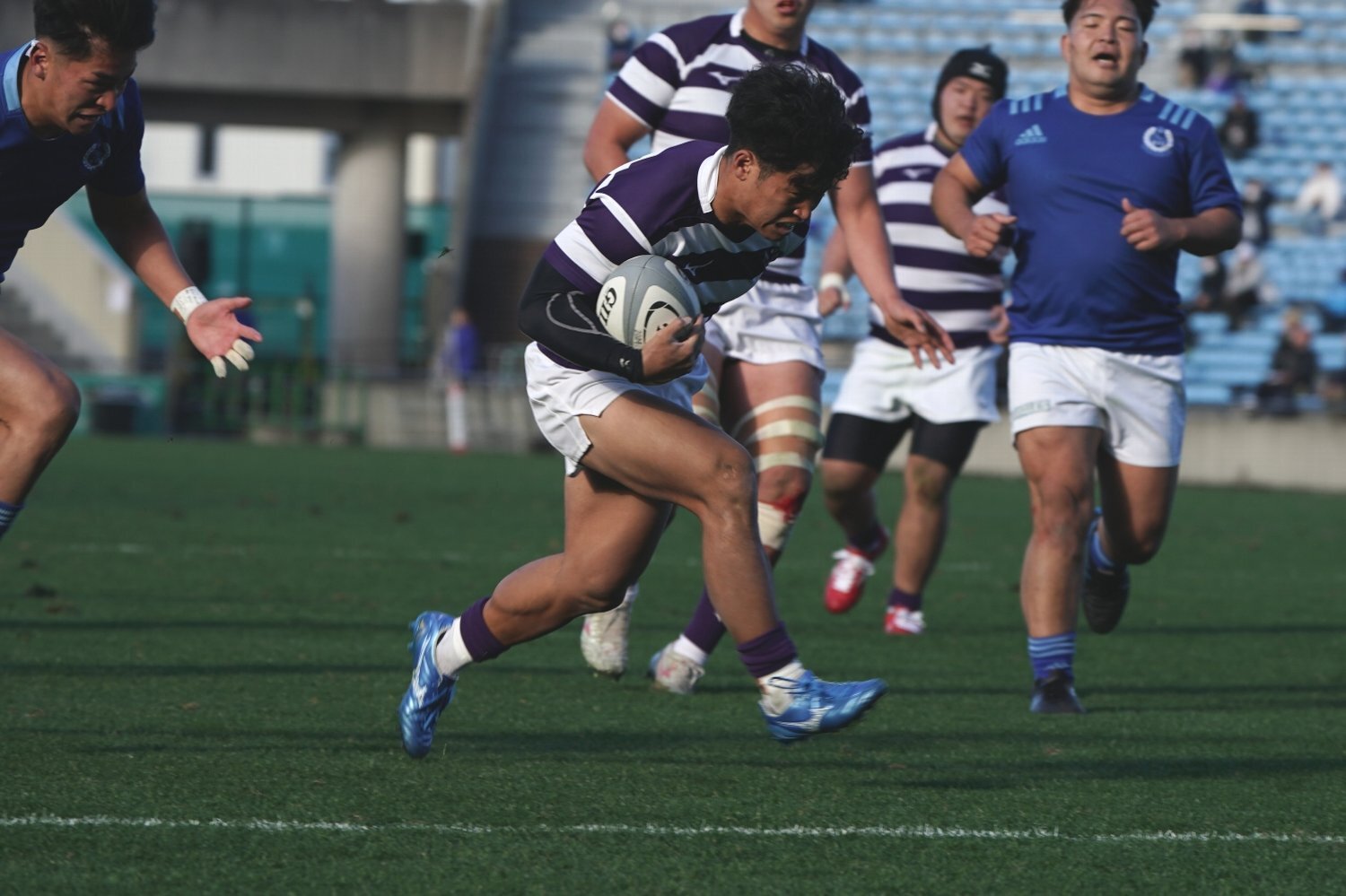21分にはゴール前のモールから、ゲームキャプテンFL福田が押さえてトライ(38-10)。26分には途中交代のWTB竹之下仁吾(2年)が自陣から60m走り切ってトライ。43-10として勝負を決めた。