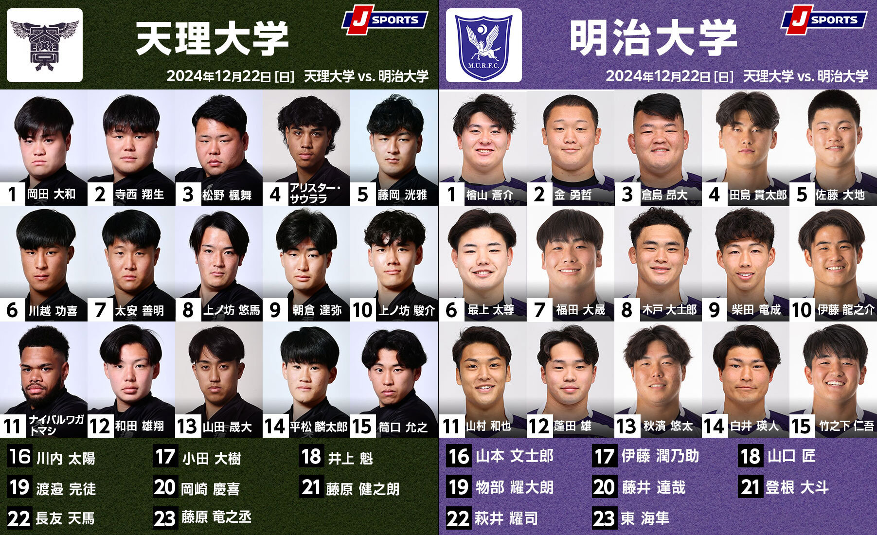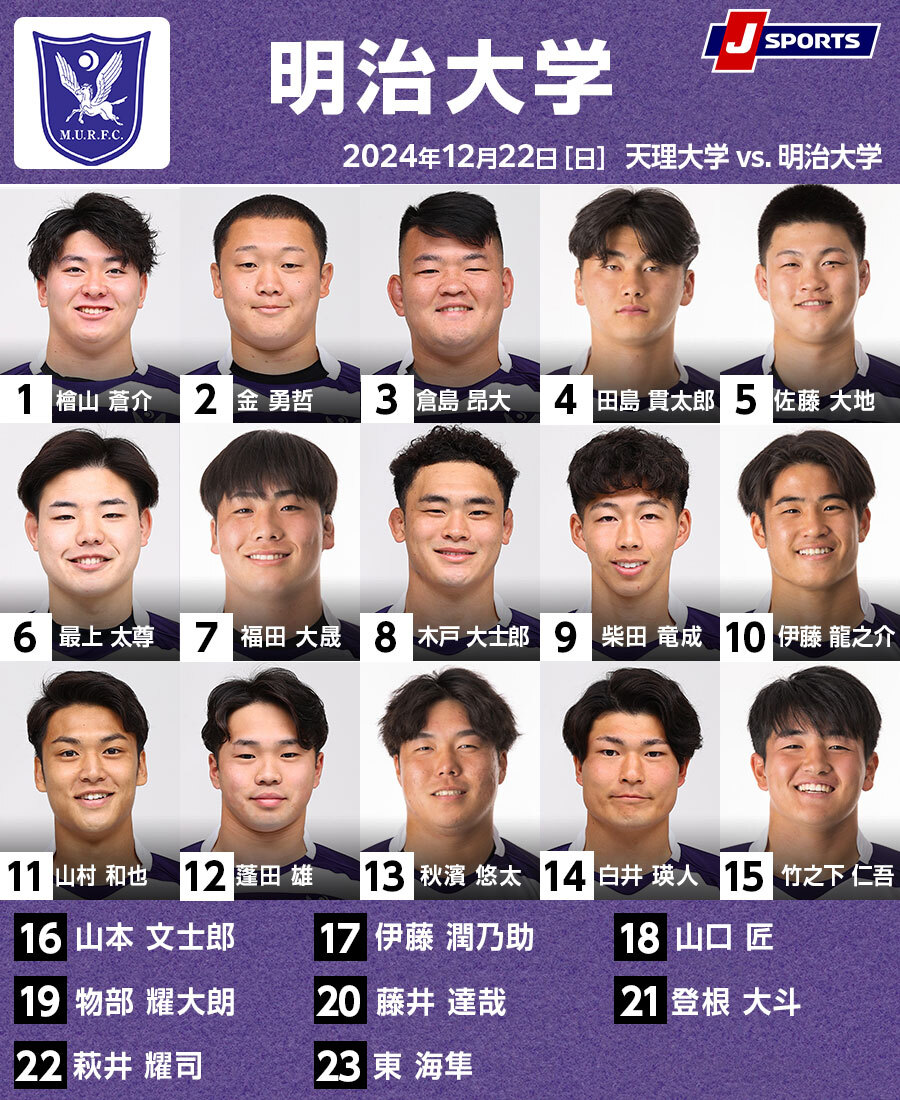 今回は、木戸と秋濱の復帰を含め、7名が交代する。東海大戦で負傷退場のWTB海老澤琥珀(2年)に代わって山村和也(3年)、プレースキッカーでもあるCTB平翔太(3年)は欠場して12番には蓬田雄(3年)、12番だった伊藤龍之介(2年)がSOに入って、萩井はリザーブからのスタートになる。不動のFBとして活躍してきた金昂平(4年)も欠場。東海大戦では途中出場でトライをあげた竹之下仁吾(2年)が先発する。竹之下は今年のU20日本代表、山村和也も高校日本代表でメンバーが変わっても見劣りしないのは明大の層の厚さを示している。