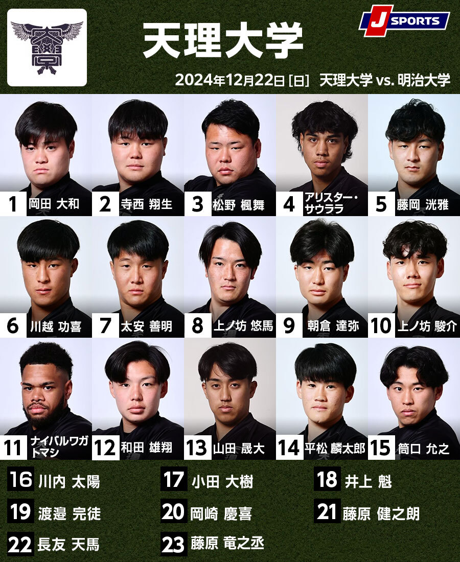 天理大は関西リーグの最終戦で京産大に勝ち、4年ぶりの優勝を飾った。近大戦では押し込まれたスクラムも修正し、HO寺西翔生(4年)、PR松野楓舞(4年)らのトライでリードすると、FL川越功喜(2年)を筆頭に力強いタックルで個々に突進力のある京産大の攻撃を食い止めた。メンバーは、関西リーグの最終戦から2名の交代。肩を負傷したNO8パトリック・ヴァカタ(4年)に代わってNO8には上ノ坊悠馬(4年、SO駿介の兄)が先発。LOは渡邉完徒(4年)がリザーブに下がって、藤岡洸雅(3年)が5番を背負う。FWの突破役であるヴァカタの欠場は痛いが、FWの機動力でカバーしたいところだ。