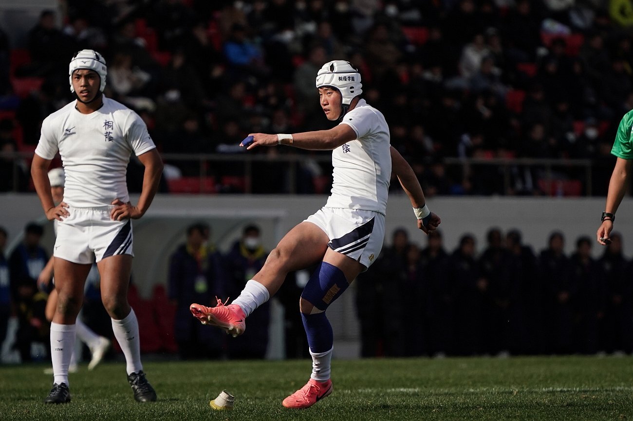 その後、桐蔭学園はディフェンスで冴えを見せ、相手に得点を許さなかった。すると21分にはアタックを継続する中で、FB(フルバック)古賀龍人(3年)が中央にトライ。ロスタイムにはSO丹羽が落ち着いてPGを決め、桐蔭学園が25-14で勝利し、連覇がかかる決勝へと駒を進めた。