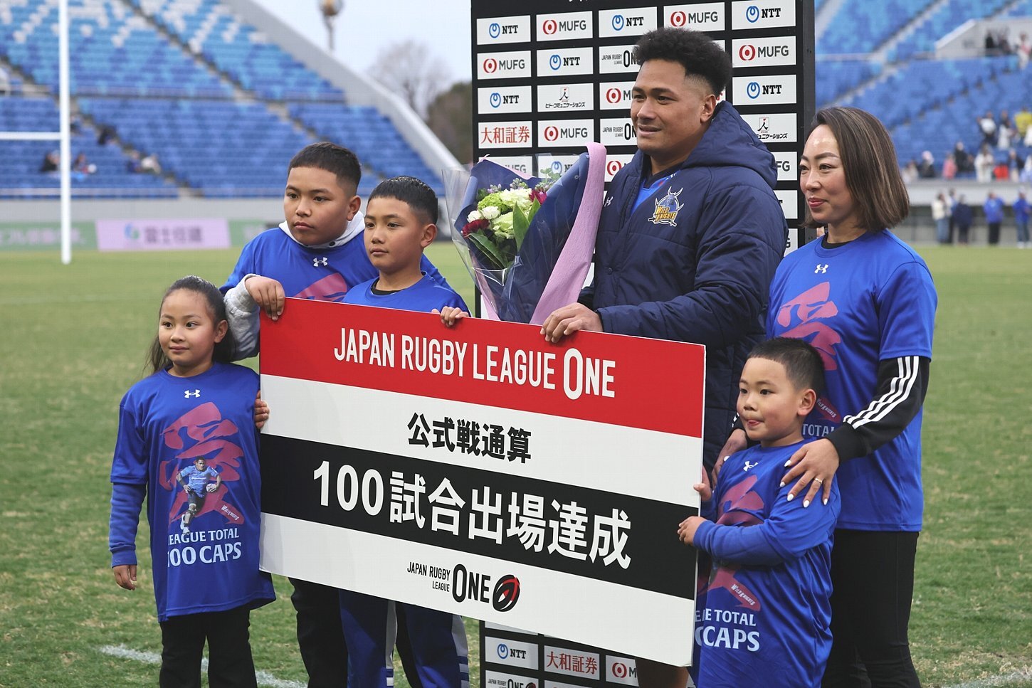 POM(プレイヤー・オブ・ザ・マッチ)にはセットプレーだけでなく、トライも挙げたLOハアンガナが選出。試合後はPRヴァルの100キャップのセレモニーが行われ、妻の愛里さんから花束をもらったヴァルは「ワイルドナイツに入って13年目、ホストで100キャップになりました。今、僕があるのはチームの仲間、コーチ、スタッフ、ファンのおかげです。優勝するためにがんばりますので、応援よろしくお願いします」と挨拶した。