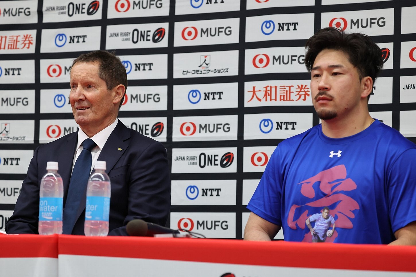 ワイルドナイツのディーンズ監督(左)と大西ゲームキャプテン