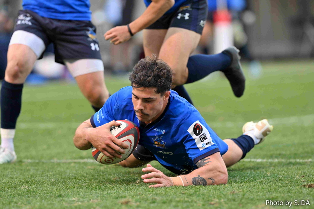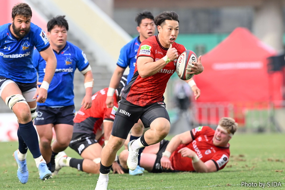 2月16日(日)、秩父宮ラグビー場には、12,288人の観衆が集った。試合は横浜キヤノンイーグルスの(横浜E)のキックオフで始まった。ボールを蹴り上げたのは今季初出場となるSO武藤ゆらぎだった。開始直後、横浜EのNO8アマナキ・レレイ・マフィの突進を止めた埼玉WKのFL長谷川崚太が負傷退場する波乱の幕開けとなる。前半3分、埼玉WKのWTB竹山晃暉が右コーナーに先制トライ。11分にもCTBダミアン・デアレンデの好判断のパスからCTBディラン・ライリー、竹山とつなぐ2つ目のトライで、12-0とリードを広げる。横浜EのFL古川聖人が得意のスティール(ジャッカル)を見せれば、埼玉WKのボールハンター、FLラクラン・ボーシェーもスティールをやり返す。緊張感あるボール争奪戦に観客の視線がくぎ付けになる。