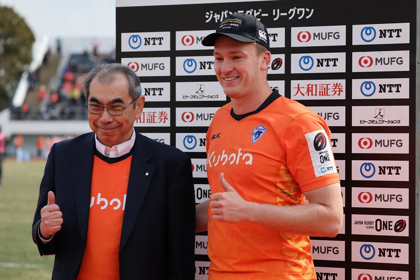 キャプテンのNO8マキシは、「静岡という強い相手で、タフな試合だとわかっていたので、準備が大切だった。23人のメンバーだけでなく、全員の勝ちだと思うし、1日1日、積み上げてきたものが結果に出た。いつも通りオレンジアーミーの応援があって、自分たちの力になった」と笑顔を見せた。