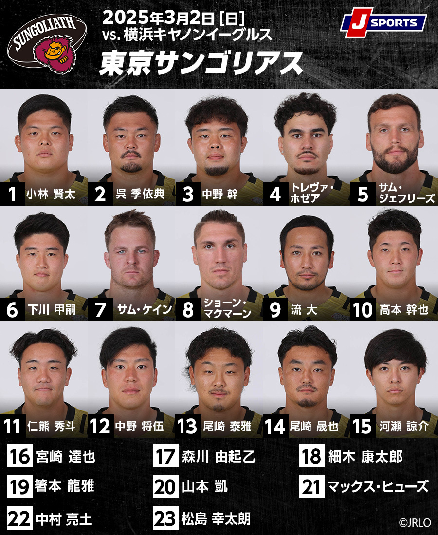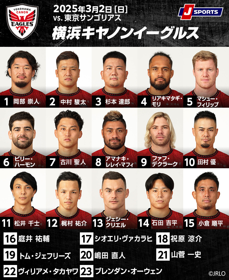 ベンチには他にHO庭井祐輔、PRシオエリ・ヴァカラヒ、祝原涼介、LOトム・ジェフリーズ、FL嶋田直人、SH山菅一史、WTBヴィリアメ・タカヤワが名を連ねる。