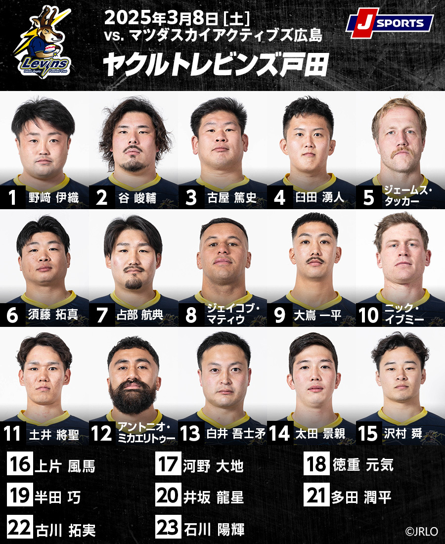 第1列はPR(プロップ)野崎伊織、古屋篤史、HO(フッカー)谷峻輔と変わらない。LO(ロック)は先週ゲームキャプテンを務めた小川正志に替わって臼田湧人が入り、ジェームス・タッカーとコンビを組む。