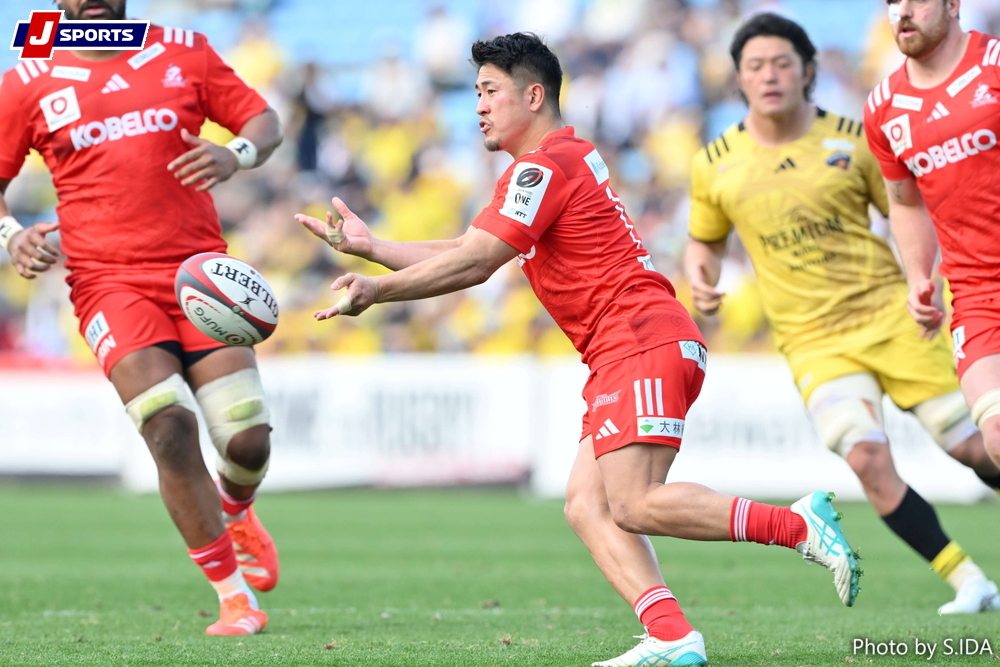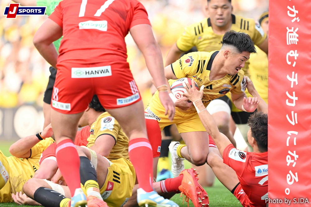 逆転に次ぐ逆転でスタジアムは興奮のるつぼと化した。3月23日(日)、快晴の秩父宮ラグビー場には、9,963人の観客が集った。午後2時30分、コベルコ神戸スティーラーズ(神戸S)のSOブリン・ガットランドのキックオフで激闘の幕が上がる。開始3分、東京サントリーサンゴリアス(東京SG)陣に深く入ったラインアウトから神戸Sが連続攻撃。最後はCTBマイケル・リトルが4人のタックラーを引き付けながら右タッチライン際のWTBアタアタ・モエアキオラにパスし、アタアタがタックラーを弾き飛ばして先制トライをあげた。