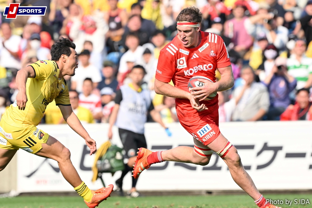 前半は神戸Sがミス、反則でボールを失うケースが多く、東京SGがチャンスを確実にものにした。19分に中野、23分にCTBイザヤ・プニヴァイがトライし、20-8と点差を広げる。流れを変える神戸Sのトライが飛び出したのは、34分だった。NO8ワイサケ・ララトゥブアのパスを受けたLOブロディー・レタリックが、軽やかなステップワークで2人のディフェンダーをかわし、約35mを走り切ってトライゾーンへ。CTB李承信がゴールを決めて、20-15に迫った。そして、40分、ラインアウトからモールを押し込んだ神戸SはHOジョージ・ターナーがトライし、20-20の同点とする。