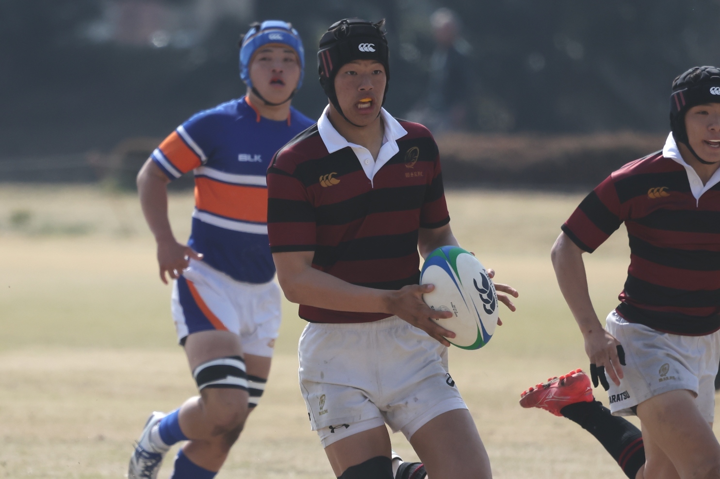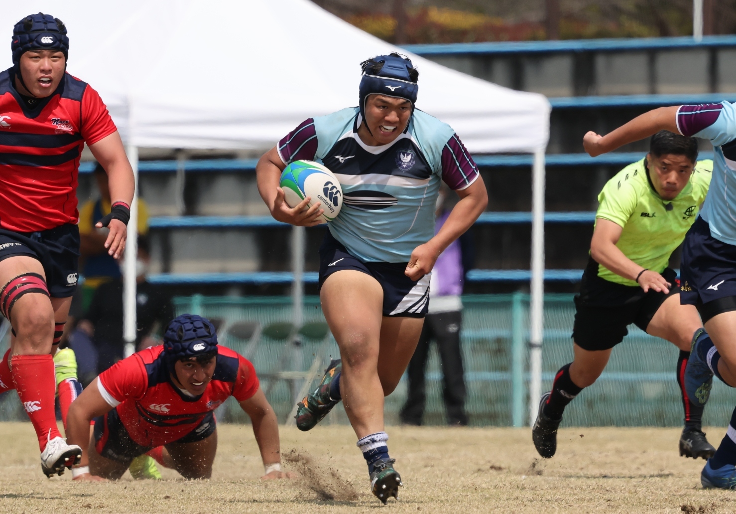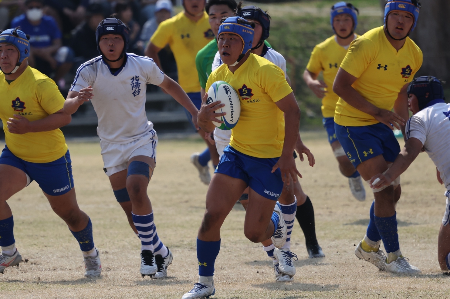 第4試合は関東新人準優勝の東海大相模(神奈川)と高鍋(宮崎)が対戦した。フィジカルで優位に立った東海大相模がボールを展開、前半だけでWTB福岡遼(2年)がハットトリックを達成し、26-7で折り返した。